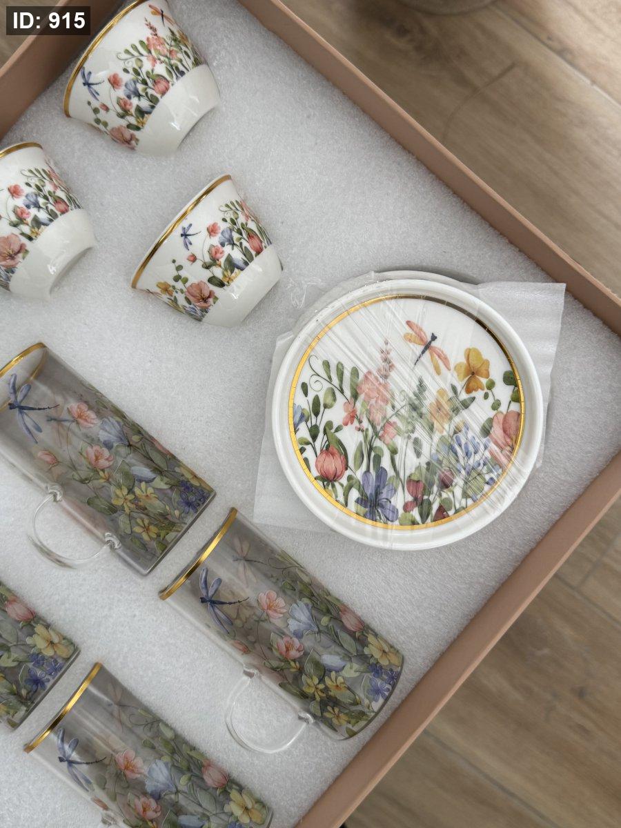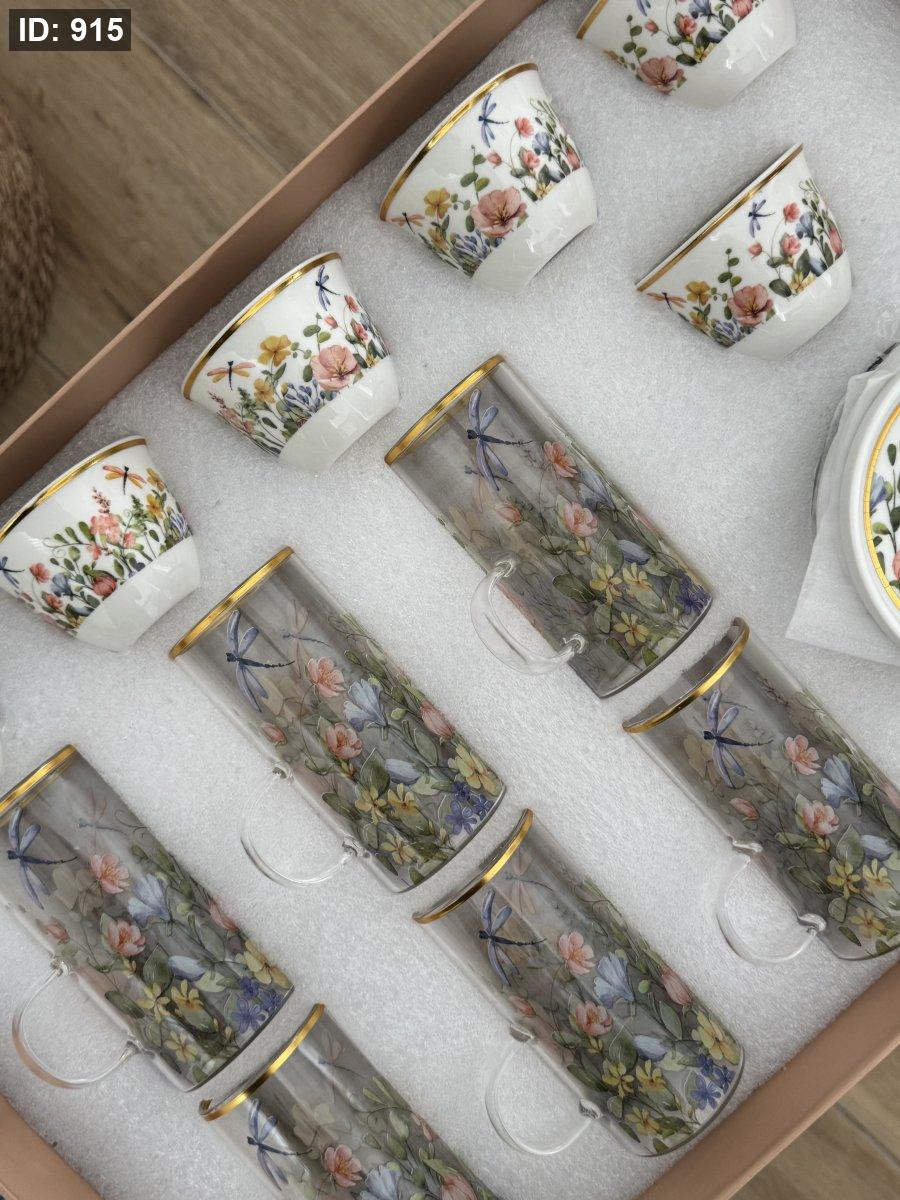 طقم ٦ كاسات شاي بالنقشة المميزة مع صحونهم +٦فناجين قهوة سادة